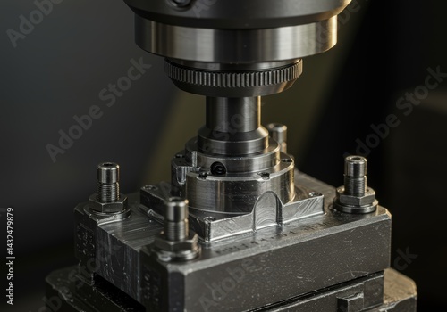 Close up view of metal machinery part in industrial production. Manufacturing equipment detail for engineering and technology concept. Machine tool element.