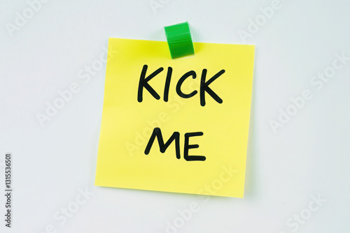 close up view of note with kick me lettering and sticky tape isolated on grey, april fools day concept