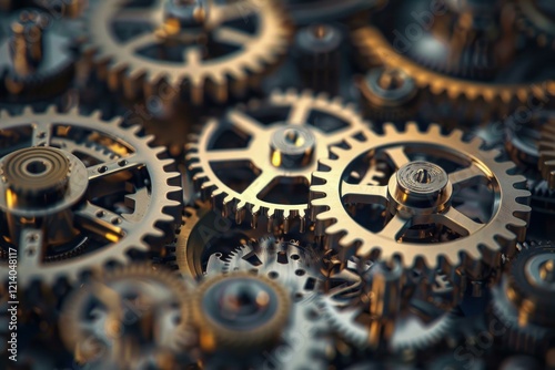 Close up view of numerous metallic gears interconnecting, showcasing the complexity of a mechanical system