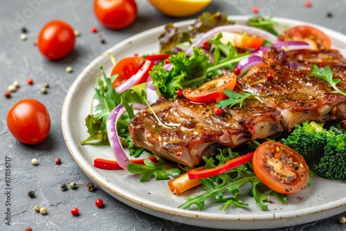 Close up view of pork steak and fresh vegetable salad on plate with light stone background