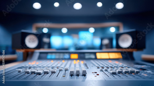 Close up view of professional audio mixing console modern recording studio, showcasing various knobs and sliders, with blurred studio monitors background, creating focused and creative atmosphere