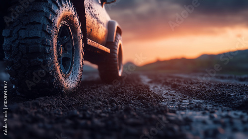 close up view of rugged off road vehicle tire on muddy path during sunset, showcasing texture of tire and surrounding terrain. scene evokes sense of adventure and exploration.