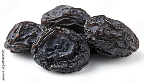 Close up view of several dark colored prunes against a bright white background. The prunes appear wrinkled and slightly glistening