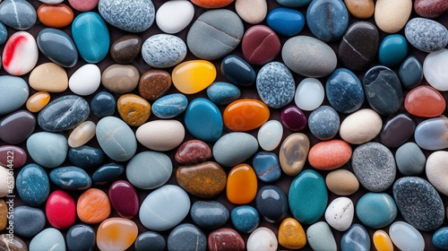 Close up view of smooth polished multicolored stones washed ashore on the beach. Nature background
