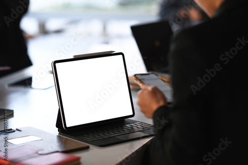 Close up view of tablet computer on office table with businesswoman texting on a smart phone.