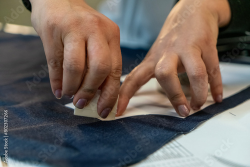 Close up view of tailor's hand marking sewing pattern on fabric with soap.