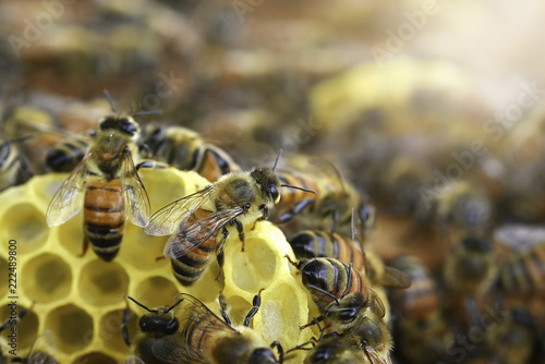Close up view of the working bees on the honeycomb with sweet honey. Honey is beekeeping healthy produce. Bee honey collected in the yellow beautiful honeycomb.