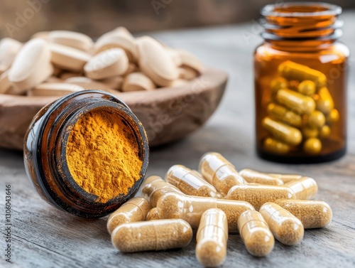 Close up View of Turmeric Powder and Beige Capsules Spilled on Wooden Surface