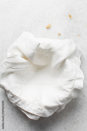 Close up view of white napkin fabric, texture of woven white cotton fabric