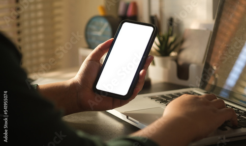 Close up view of woman hand holding mobile phone and using laptop computer.