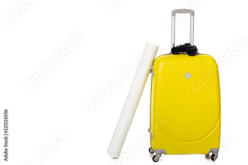 close up view of yellow suitcase, map and binoculars isolated on white