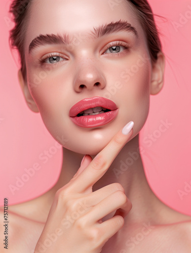 Close up view of young beautiful caucasian woman face over pink background. Lips contouring, SPA therapy, skincare, cosmetology and plastic surgery concept