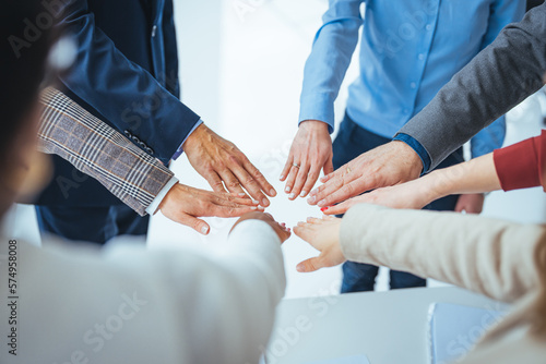 Close up view of young business people putting their hands together. Stack of hands. Unity and teamwork concept. Close-up of co-workers stacking their hands together. Diverse business people