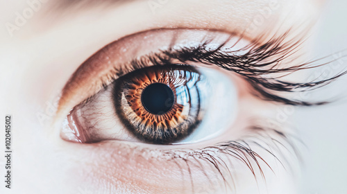 Close up woman eyes. Macro classic volume long eyelash extensions, lamination, correction. Natural beauty or laser vision correction. Skin care, beauty, makeup concept.