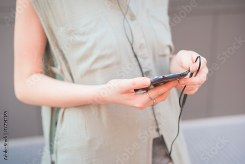 close up woman hand outdoor using smart phone - technology, social network, communication concept
