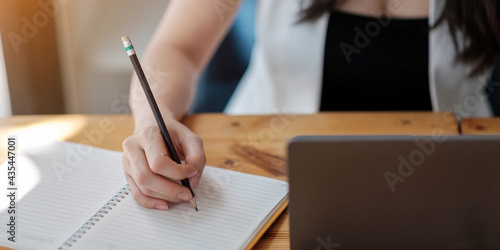 Close up woman's hands with laptop computer, notebook and pen taking notes in business office
