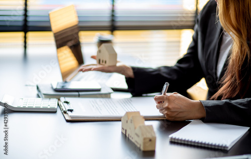 Close up wooden toy house with business woman signs a purchase contract or mortgage for a home, Real estate concept.