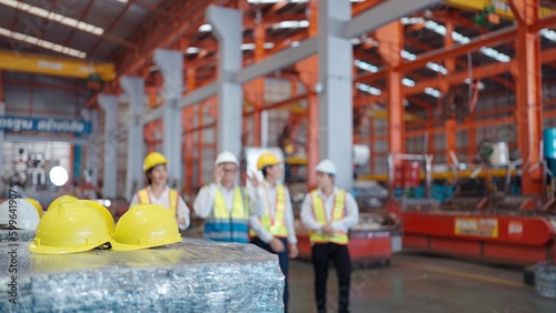 Close up yellow helmet on the table and team of warehouse workers in safety uniform walking at factory background