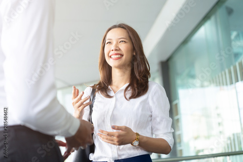 close up young confident businesswoman talking about business future with partner to explaining mission and vision of development and marketing in the global at outside conference room