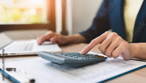 close up young woman hand press on calculator to check and summary expense of home loan mortgage for refinance plan , people lifestyle concept
