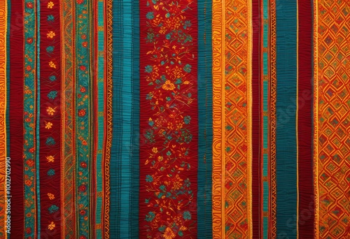 close view brightly colored fabric patterns showcasing intricate textures rich visual design elements, colorful, vibrant, textile, material, weaving