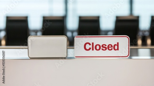 Closed airport counter with empty chairs and a sign indicating no flights available. A symbol of travel disruption and unexpected changes in plans.
