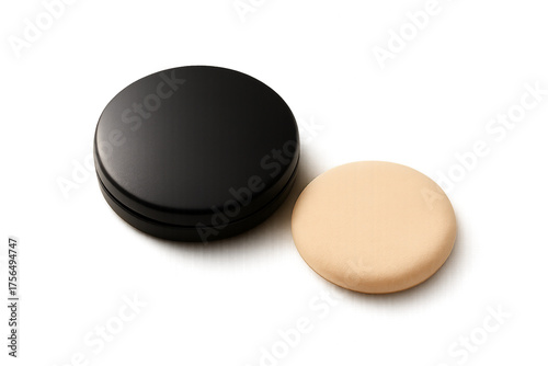 Closed Compact Mirror and Powder Puff on Transparent Background with Realistic Studio Lighting and Soft Shadow