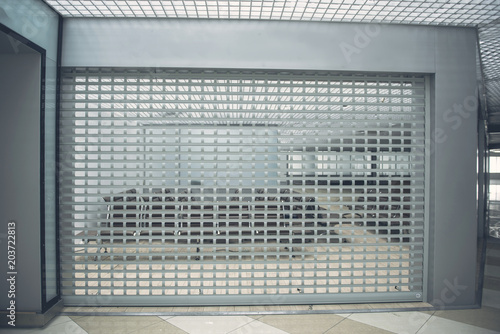 Closed door to iron grid locating between two rooms. Modern chairs are opposite it