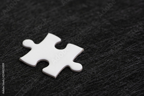 Closed up of white jigsaw puzzle on dark black background using as answer, solution, completion or strategy for business success