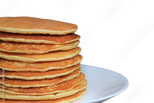 Closed up stack of fresh homemade plain pancakes served on plate, white background with free space for text or design