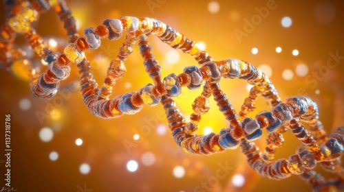 Close-up 3D Human DNA Strand Spiral on Vibrant Gradient Background with Orange Yellow Blue Color Scheme