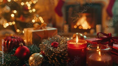 Closeup 4k panning footage of burning candles, lanterns, gifts, preents, Christmas wreath and colorful baubles on table against burning fireplace and Christmas tree. Perfect shot for winter.