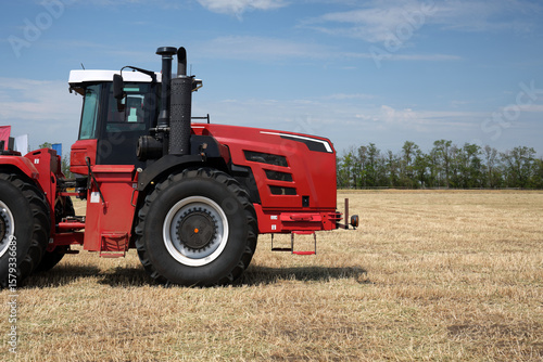 Close-up a red tractor work with a plow in a field. Start tillage after harvest.