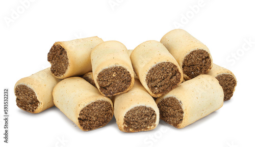 Close-up and selective focus top view of special treats for dogs in the form of bones. Pattern and texture of baked cookies with meat filling for pets.Healthy, tasty and balanced nutrition for animals