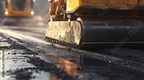 Close-up Asphalt Paver Machine Constructing Road - Industrial Construction Equipment in Action