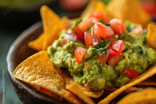 Closeup avocado guacamole dip with tortilla chips nachos