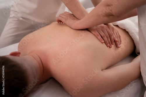 Close-up back massage of a man, massage training, masseurs in 4 hands
