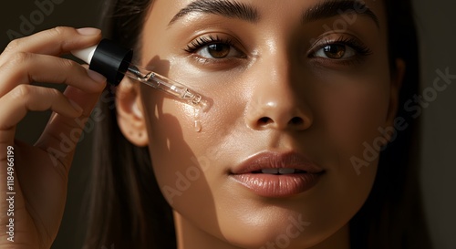 Close-Up Beauty Portrait of a Woman with Glowing Skin Applying Vitamin C Serum with a Pipette Dropper – Perfect for Skincare, Moisturising, and Nourishing Product Advertisements