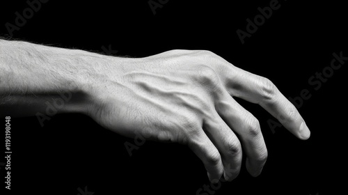 Close-up black and white photo of a man's hand reaching.