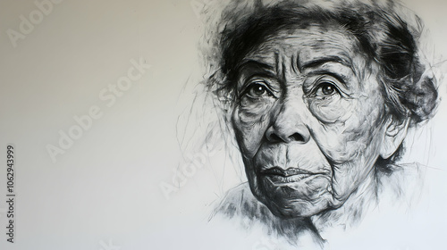 Close-up black and white portrait of an elderly woman with wrinkled face and deep-set eyes looking to the side.