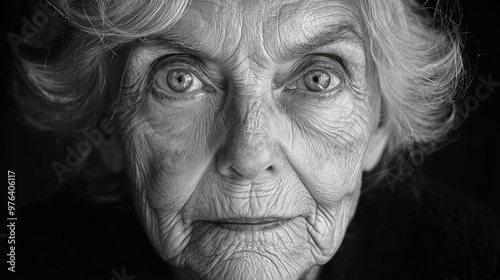 Close-up black and white portrait of an old woman at the table in the home.