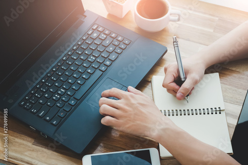 Closeup. Businessman writing on notebook and using smartphone and laptop working online