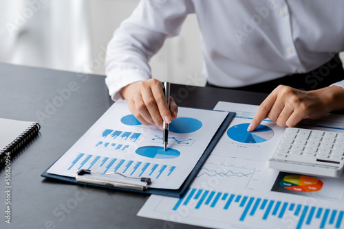 Close-up businesswoman's hand holding a pen pointing at a bar chart on a corporate financial information sheet, the businesswoman examines the financial information provided by the finance department.