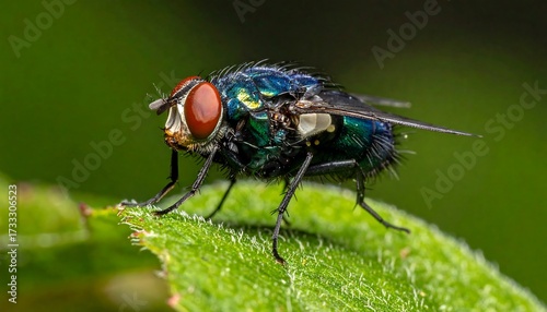 Close-up captures a metallic green fly on a leaf, showcasing its red eyes and intricate details. The backdrop is blurry
