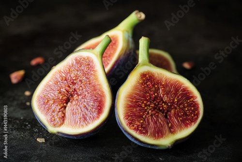 Close-up captures the beauty of ripe figs sliced in half, showcasing their rich red interior filled with tiny seeds. The dark background enhances their vibrant colors and textures