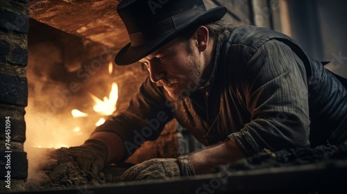 Close-up capturing chimney sweep's skilled hands dismantling fireplace surrounded by soot-covered tools