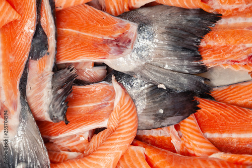 Closeup carving whole fresh norwegian salmon fish with heads on red cutting board in professional kitchen restaurant, preparing fillet. Concept sushi, sashimi, semi-finished product