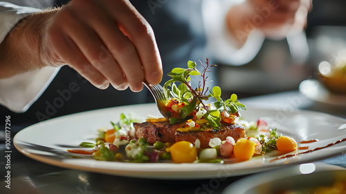 Close-up, chef and food garnishing for fine dining, restaurant cuisine and dinner. Professional worker, creative and cropped closeup image of a hand preparing a delicious healthy meal in a kitchen.