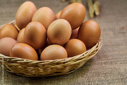 closeup chicken eggs in a wicker basket isolate on the table