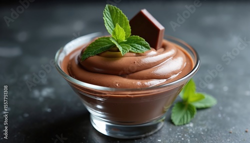 Close-up chocolate mousse dessert. Fresh mint garnish in a glass bowl. Gourmet sweet treat for breakfast, lunch, dinner or snack. Chocolate pudding with mint leaves.